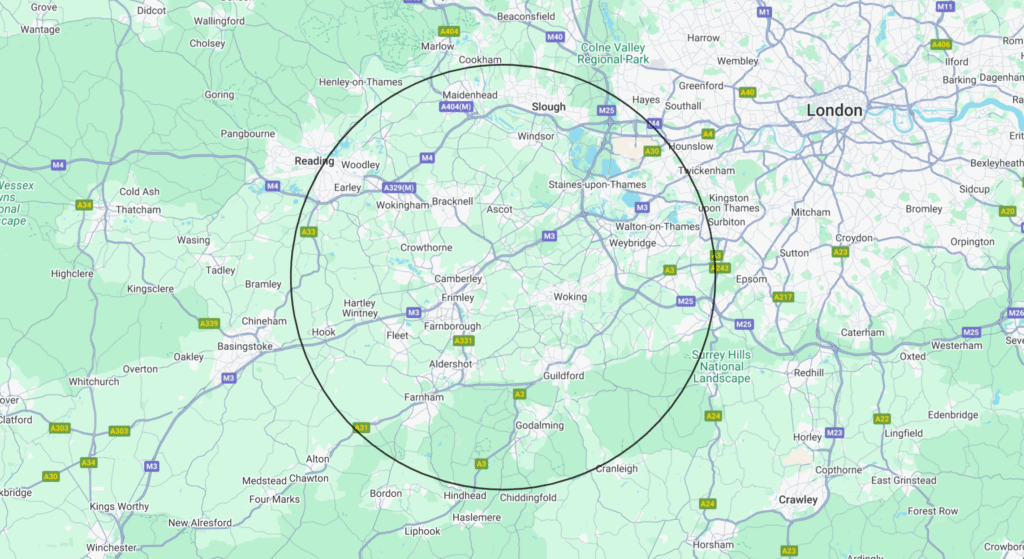 To the left-hand side shows the radius we cover. Visit the ‘Area Coverage’ dropdown for a full breakdown of the main towns we cover.